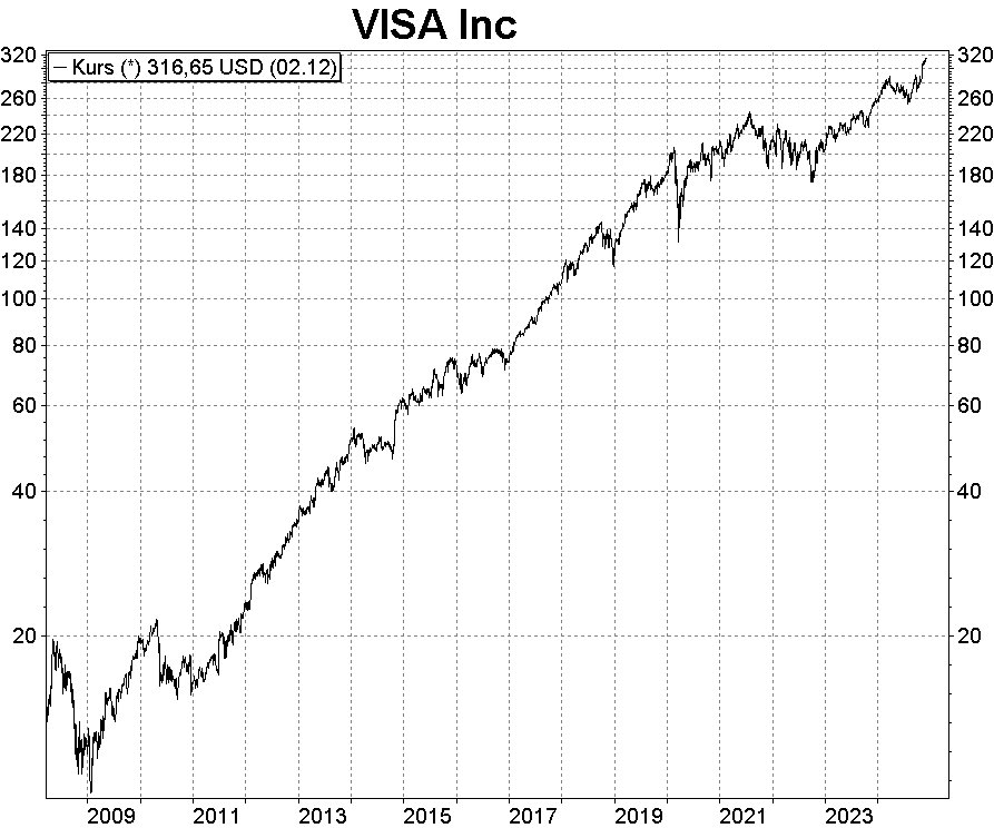 Fazit: Visa betreibt das weltweit größte IT-Netzwerk, bestehend aus Datenzentren mit zugehöriger Software und Sicherheitsinfrastruktur. Über VisaNet, so der Name des Netzes, wickelt Visa Zahlungen in über 200 Ländern und Regionen sowie in etwa 160 Währungen zwischen Verbrauchern, Unternehmen, Händlern, Finanzinstituten und Regierungen ab. Wichtig: Visa selbst gibt keine Karten aus, gewährt keinen Kredit und legt keine Zinssätze fest – ein gravierender Unterschied zu traditionellen Banken. Stattdessen bietet Visa seinen Kunden und Partnern ein über Dekaden gewachsenes und technologisch perfektioniertes Netzwerk für den elektronischen Zahlungsverkehr. Dafür erhält Visa ein Transaktionsentgelt. In Analogie zur Eisenbahn kann man auch von einem „Schienennetz“ für weltweite Zahlungen und Geldbewegungen sprechen. Ohne Schienen kein Transport von Gütern und Personen mit der Eisenbahn. Und ohne VisaNet kein elektronischer bzw. digitaler Transport von Geld. Es handelt sich also um einen netzgebundenen Markt mit Visa als dem klaren Marktführer. Mit dieser grandiosen Marktstellung dürfte Visas Erfolgsgeschichte noch lange nicht vorbei sein.
